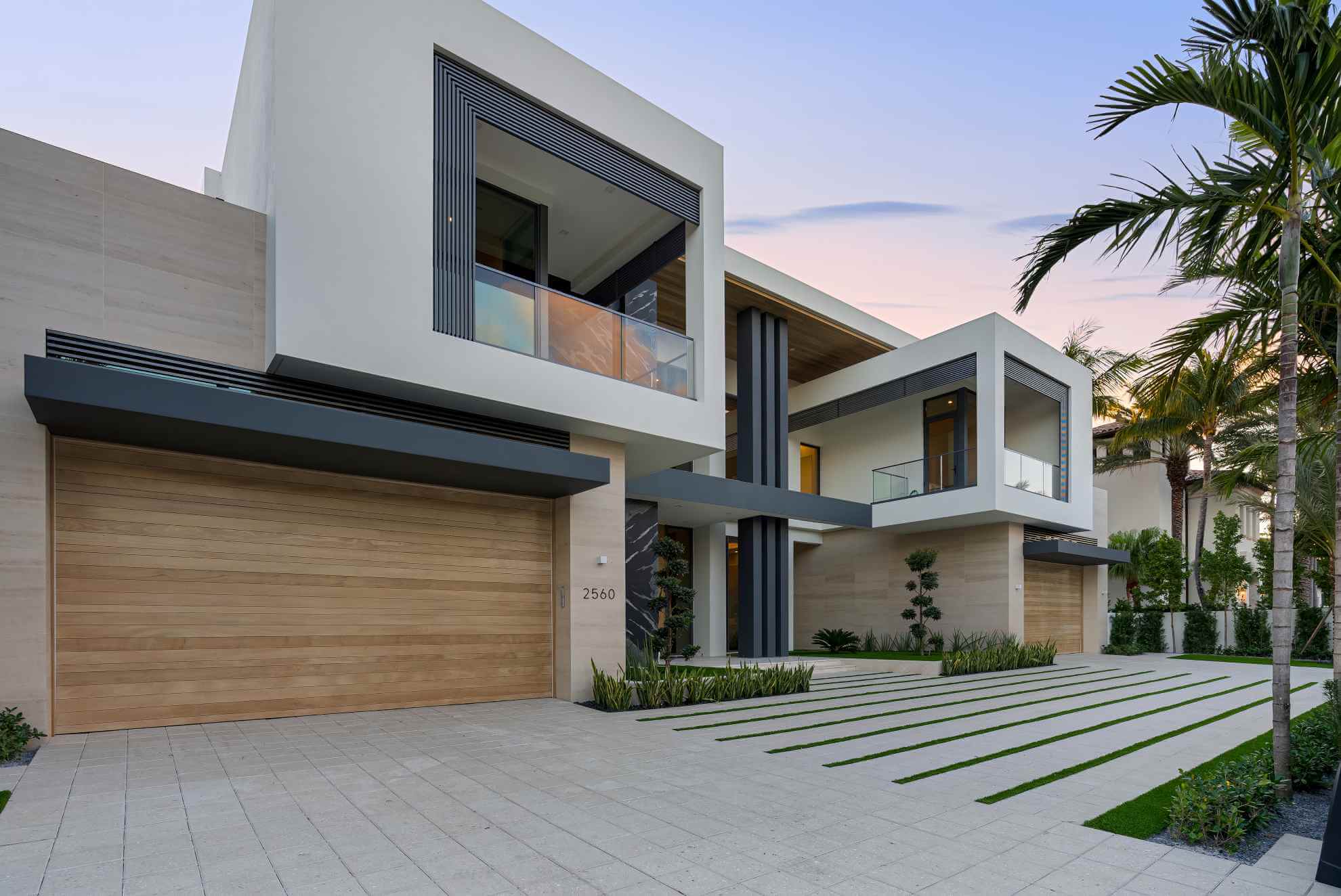This stunning coastal modern estate features a striking white stucco façade with natural wood and black marble accents, blending modern design with warm, luxurious finishes. Inside, soaring ceilings, wide-plank oak floors, and a dramatic vertical wood installation create a captivating architectural statement.